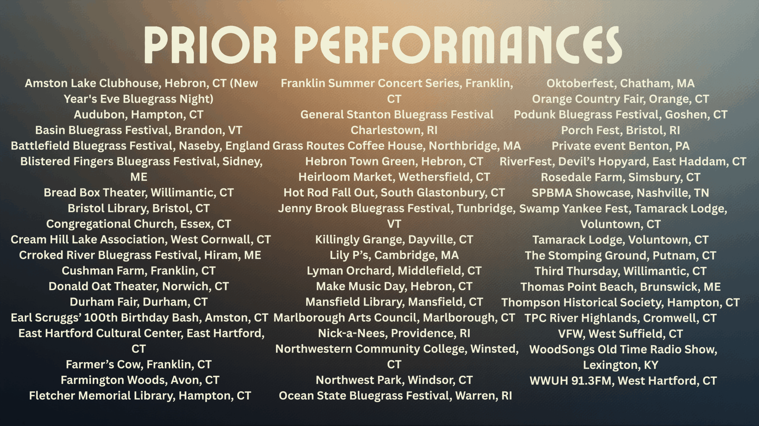 Our next scheduled show is Jan 10, 2025 at the Parish Center for the Arts in Westfield, MA. Find us on Bandsintown and receive notices when we are playing near you! Now booking for 2026, contact: 860-333-4845 or hosmermountainboys@gmail.com